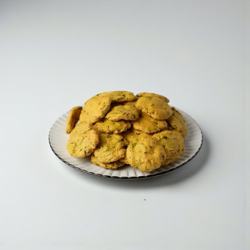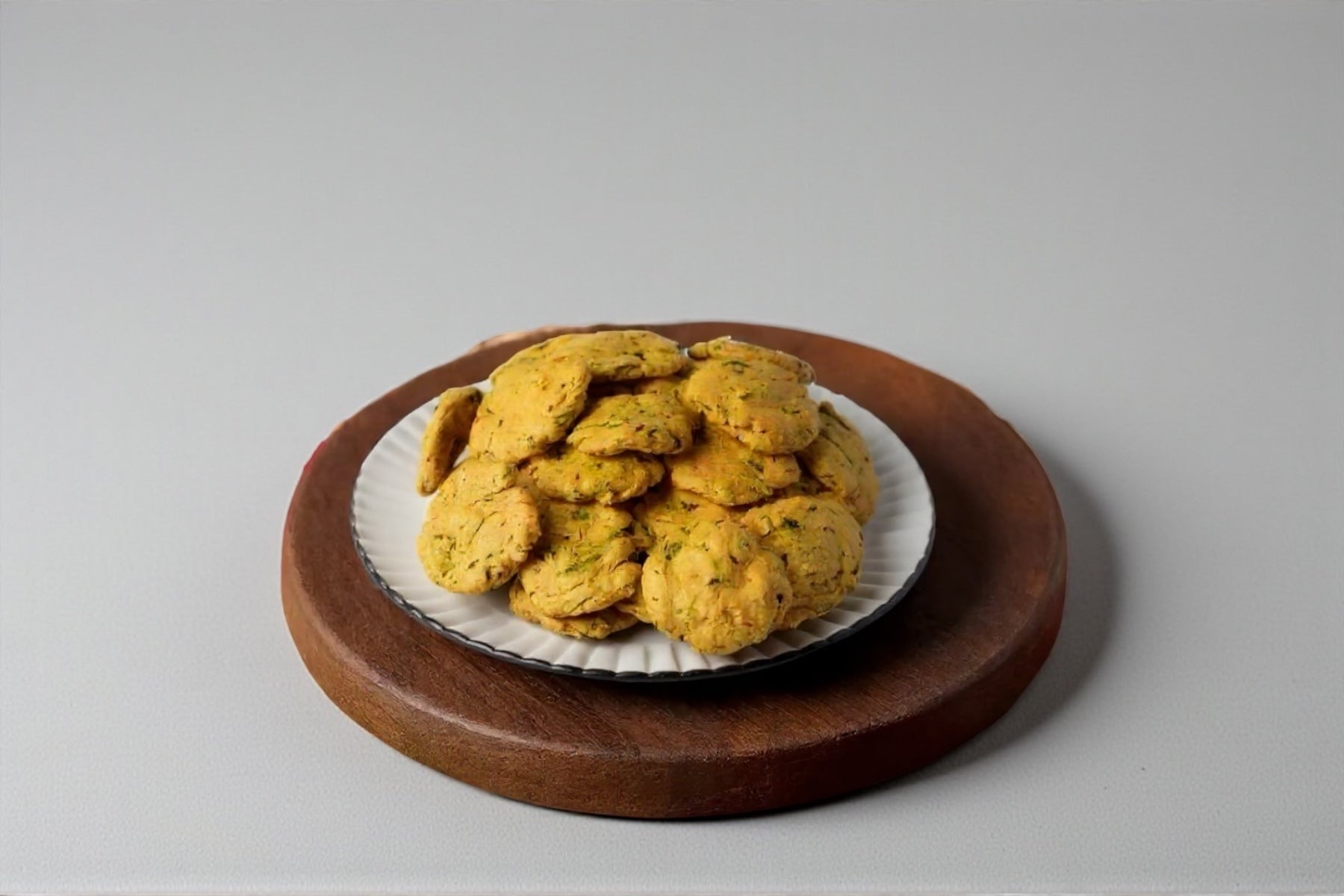 Traditional North Indian mathri infused with the goodness of spinach (palak) and flavorful spices. These flaky, crispy snacks are deep-fried to perfection and make a great tea-time companion or festive munch. Enjoy the perfect balance of taste and health with every bite.