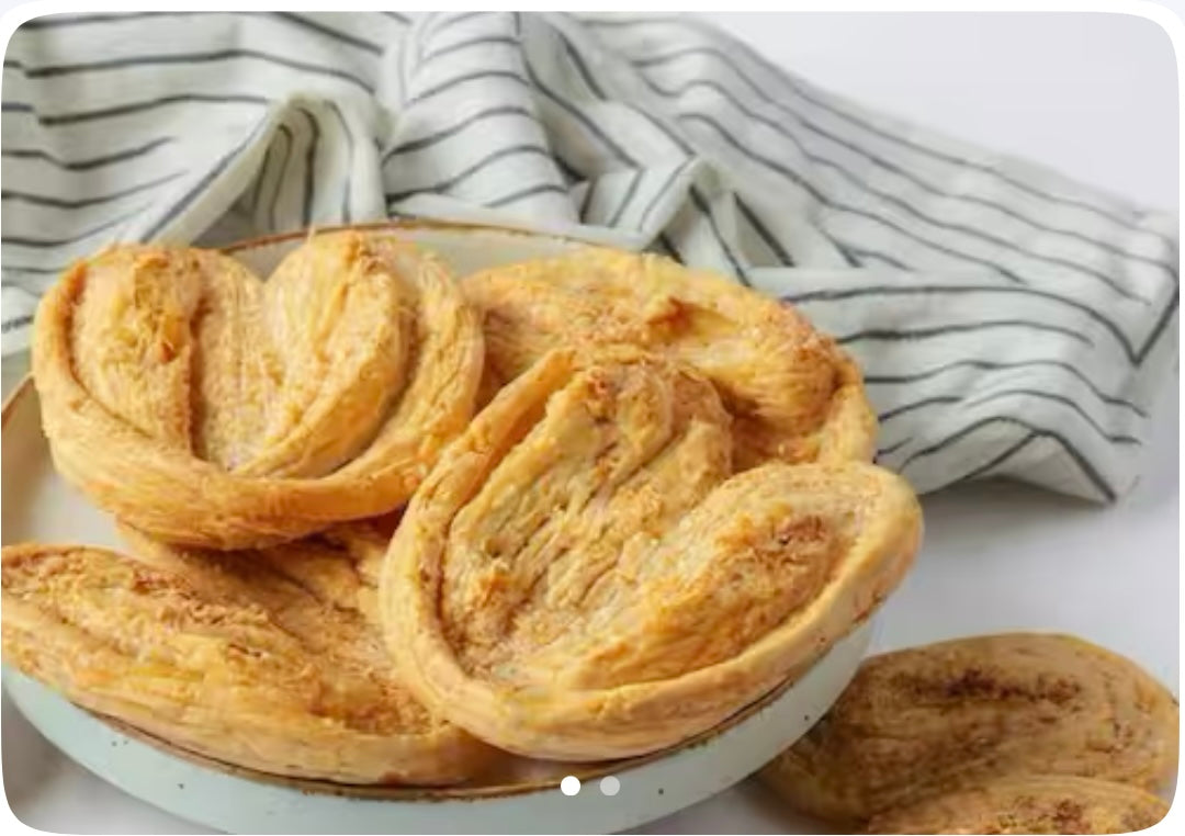 [Veg preparation] Crispy bakery delight sweet fan light, crispy and heart shaped sweetfin [also known as French heart] is a flaky bakery rusk with a mild sweet glaze. Made from layered dough and baked until golden and crunchy, it’s the perfect partner for chai or coffee. A timeless snack that blends melt in mouth layers with a satisfying crunch.